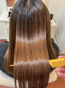 Q3. 髪へのダメージが心配です。 当店の薬剤は、髪と同じ弱酸性。従来のアルカリ矯正に比べて負担が非常に少ないのが特徴です。さらに「つるりんちょシリーズ」を併用することで、施術前よりツヤが増す方も多いですよ。